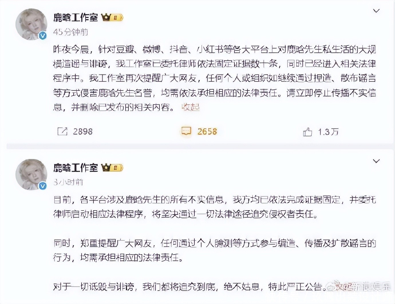 也是司晓迪信口胡诌,总之这边的故事还不等编圆,被中伤的鹿晗工作室就已经迅速发声明辟谣了,并表示已完成取证要走法律程序了。