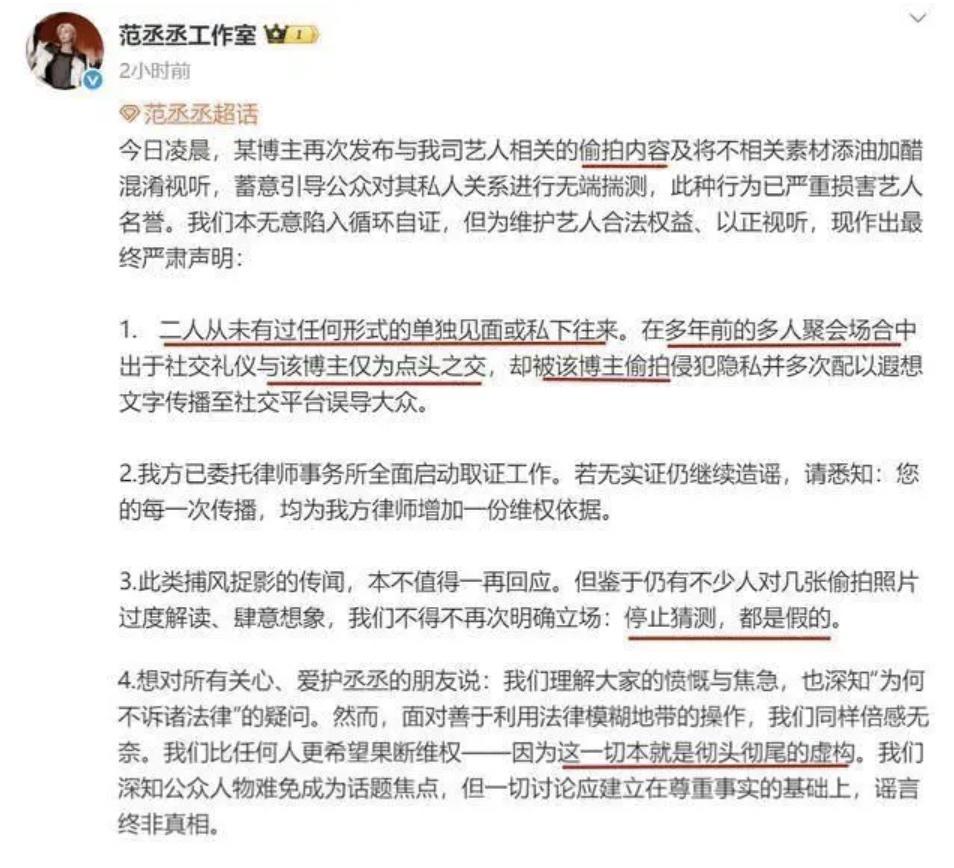 结果可想而知,自然是再被工作室光速打脸,声明照片均来自多年前的多人聚会场合,范丞丞出于社交礼仪答应合照,双方从未有过任何形式的私下往来,希望大家理智吃瓜。